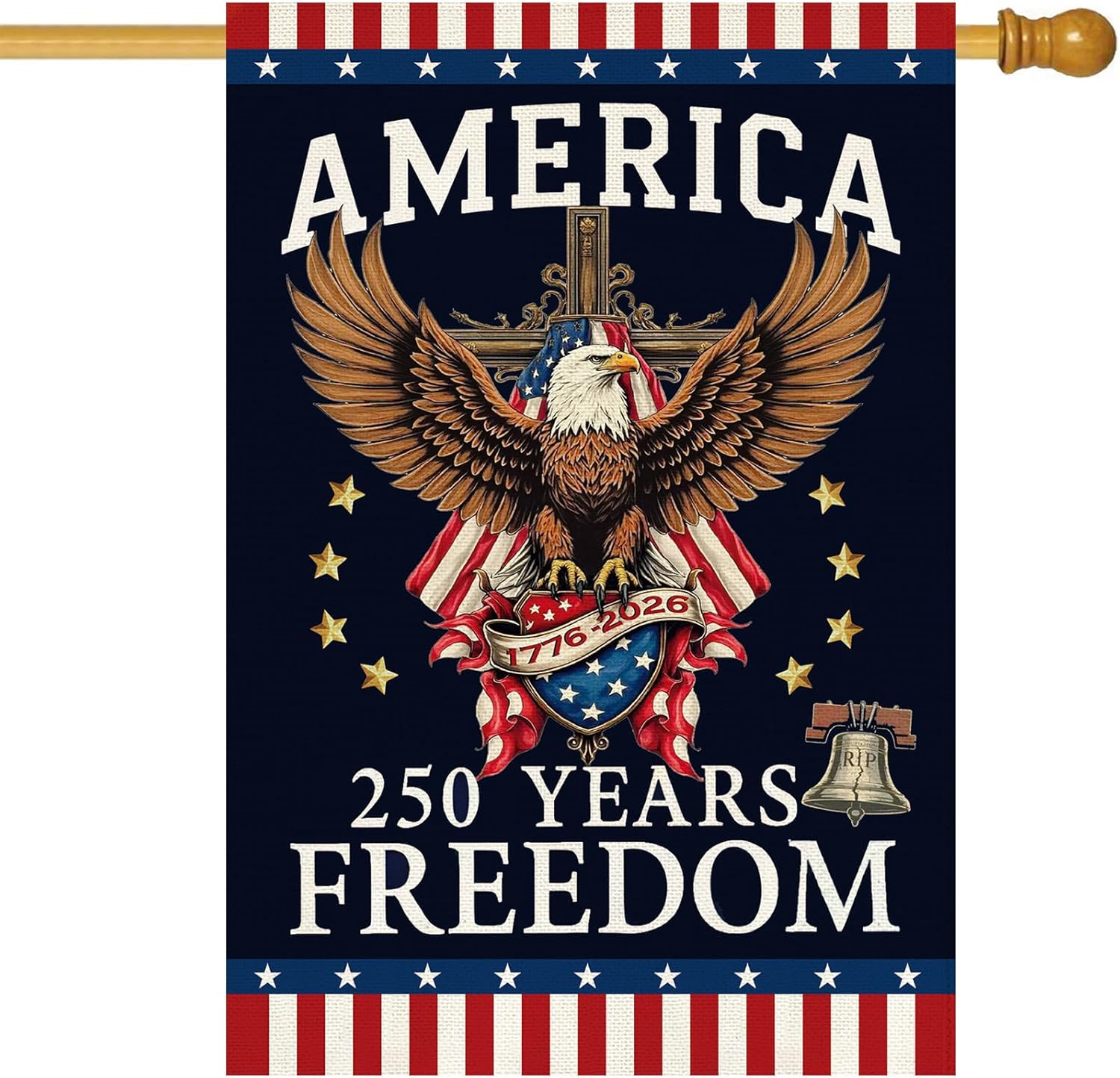 - Right Size And Easy Install: USA 250th Anniversary house flag is large big size 28 x 40 inch. 250 Years America house flag has an anti-skid hook (tab) at the top of the sleeve is slotted to keep the flag from sliding down and can be used with any standard Pole/ Stand/Bracket/Arbors(Flag Pole NOT Included)