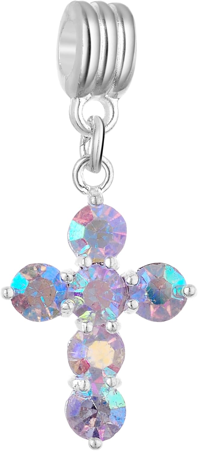 RUBYCA Crystal Cross Dangle Charms for Bracelets Jewelry Making Silver Plated Pendant Beads (AB Clear, 10pcs)
