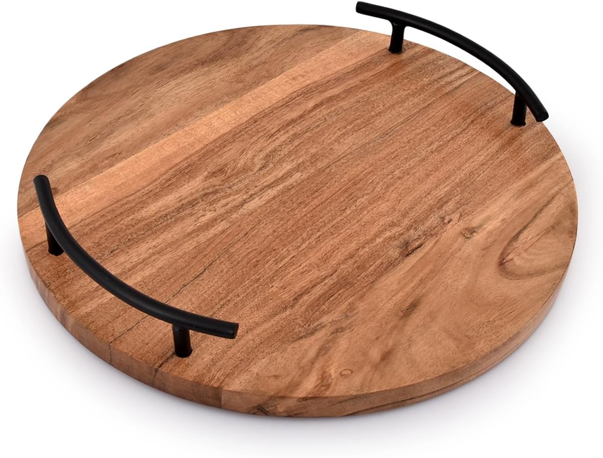 - Our round wood tray is designed with multiple purposes in mind. Adorned with retro black Iron handles for enhanced visual appeal and easy handling, it can serve as a chic table centerpiece. Use it to display your favorite trinkets, candles, perfumes, or vanity for a beautifully arranged display.