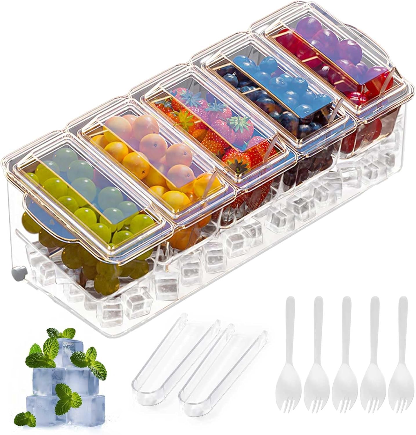 Large Ice Chilled Condiment Caddy,Chilled Condiment Containers Server with Lids for 5 Removable Compartments ,Serving Platters , Fruit & Garnish Tray for Party Supplies & Bar Accessories-Transparent