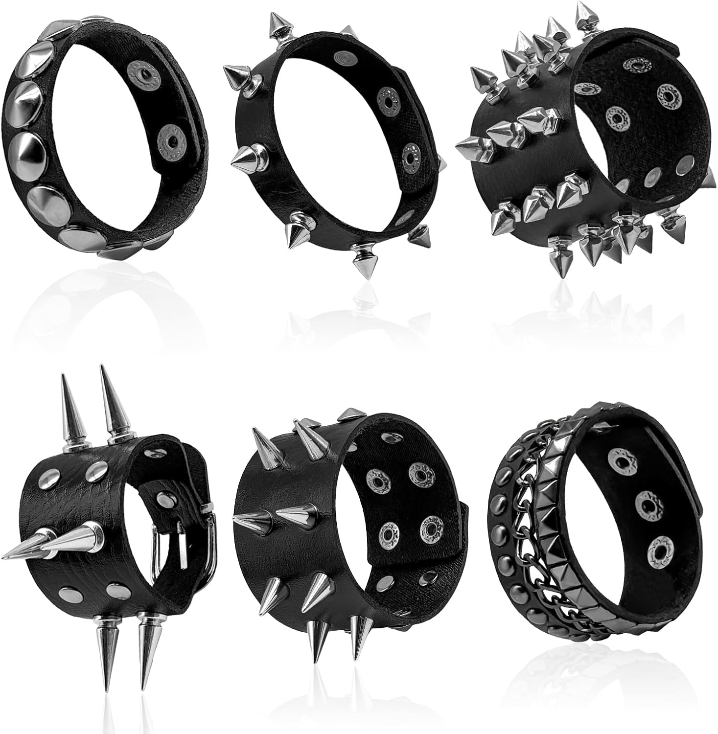 6 Pieces Punk Studded Bracelet,Spiked Leather Rivets Studded Bracelet,Spike Cuff Adjustable Metal Wristband Gothic for Halloween Men Women Accessories