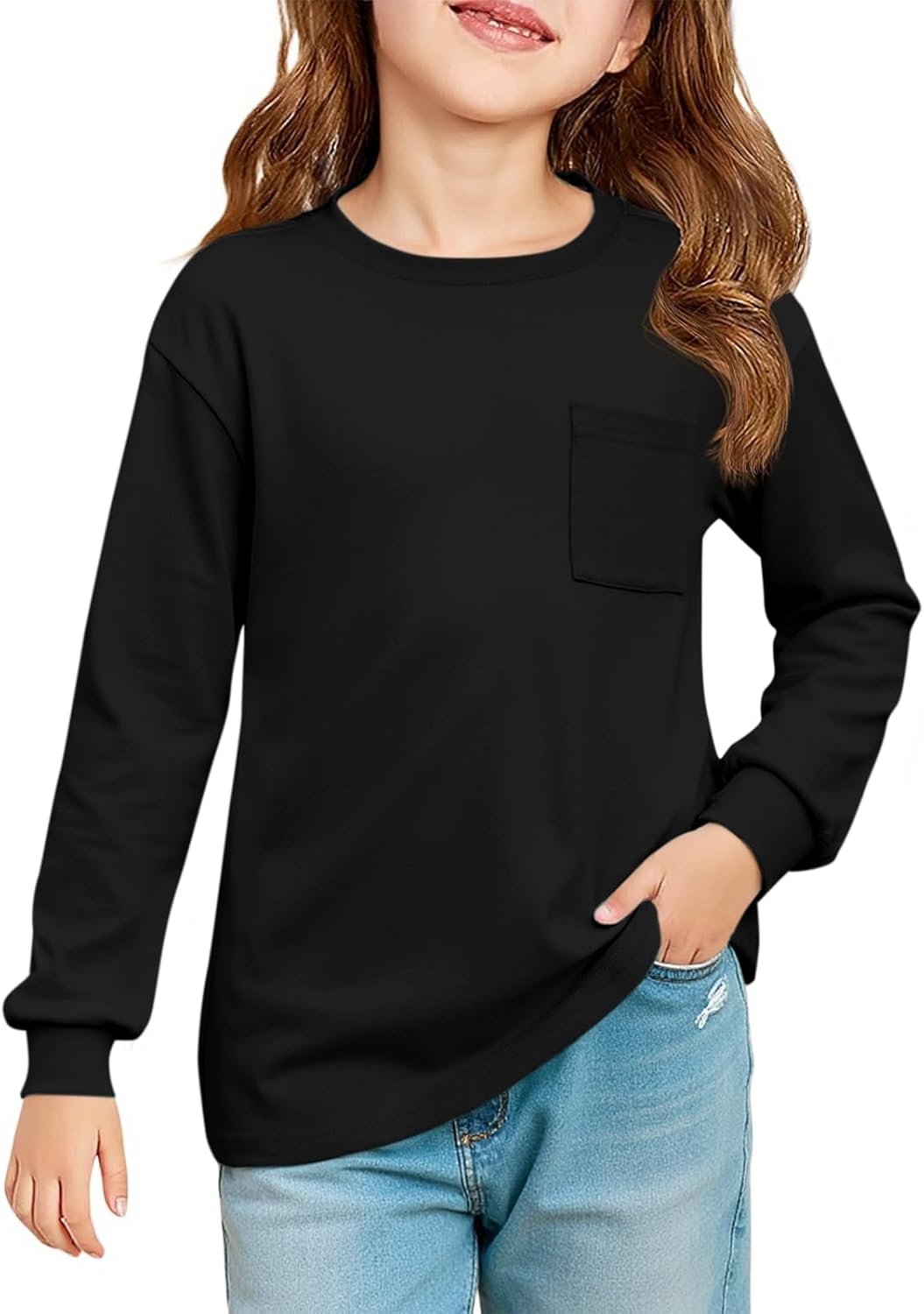 Haloumoning Girls Long Sleeve Shirts Kids Crewneck Soft Tunic Tops Basic Casual T-Shirts 5-14 Years with Pocket