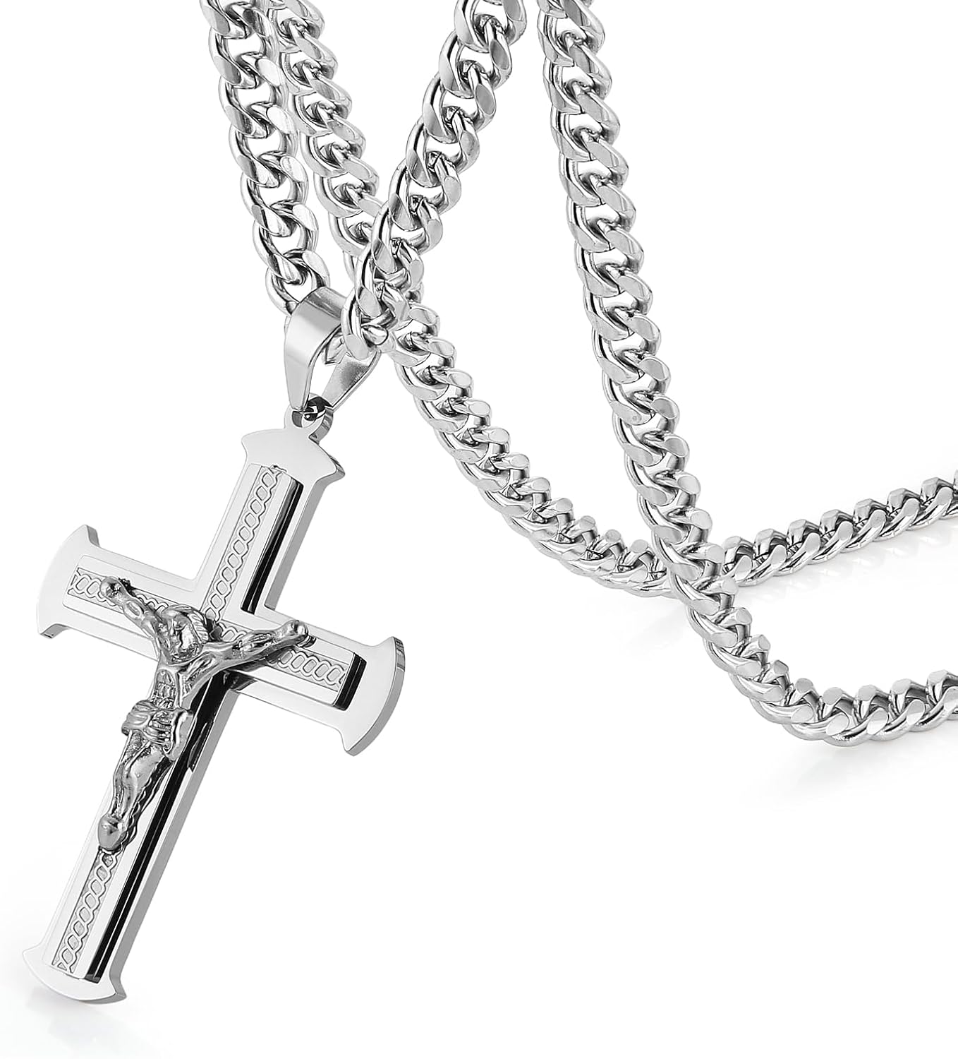 HZMAN Jesus Cross Necklace for Men Stainless Steel Large Crucifix Cross Necklace Pendant Christian Jewelry Gift with 24Inch Cuban Chain