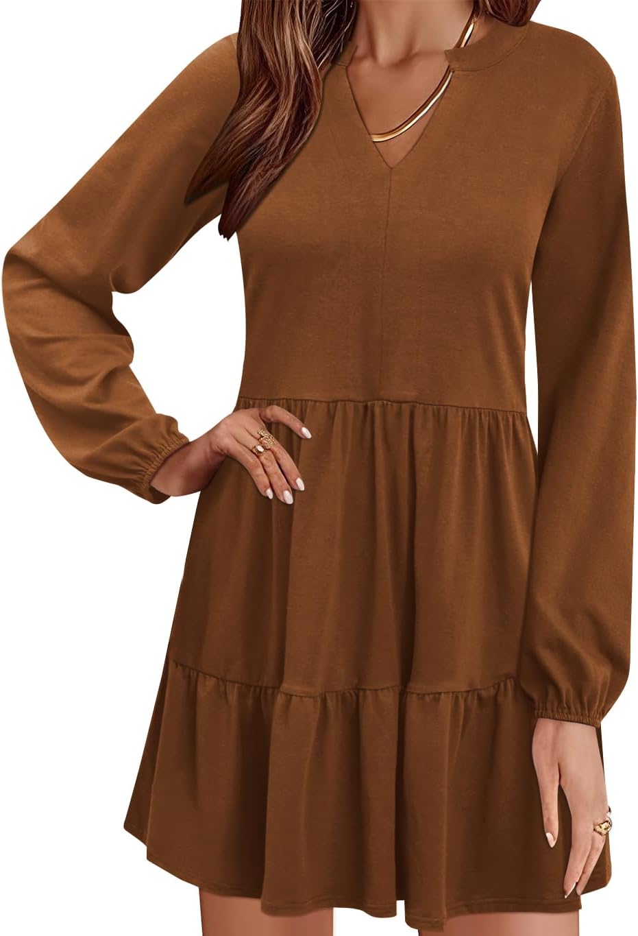QACOHU Women Spring Tunic Dress 2026 V Neck Casual Tiered Long Sleeve with Pockets A-Line Swing Mini Babydoll Dress