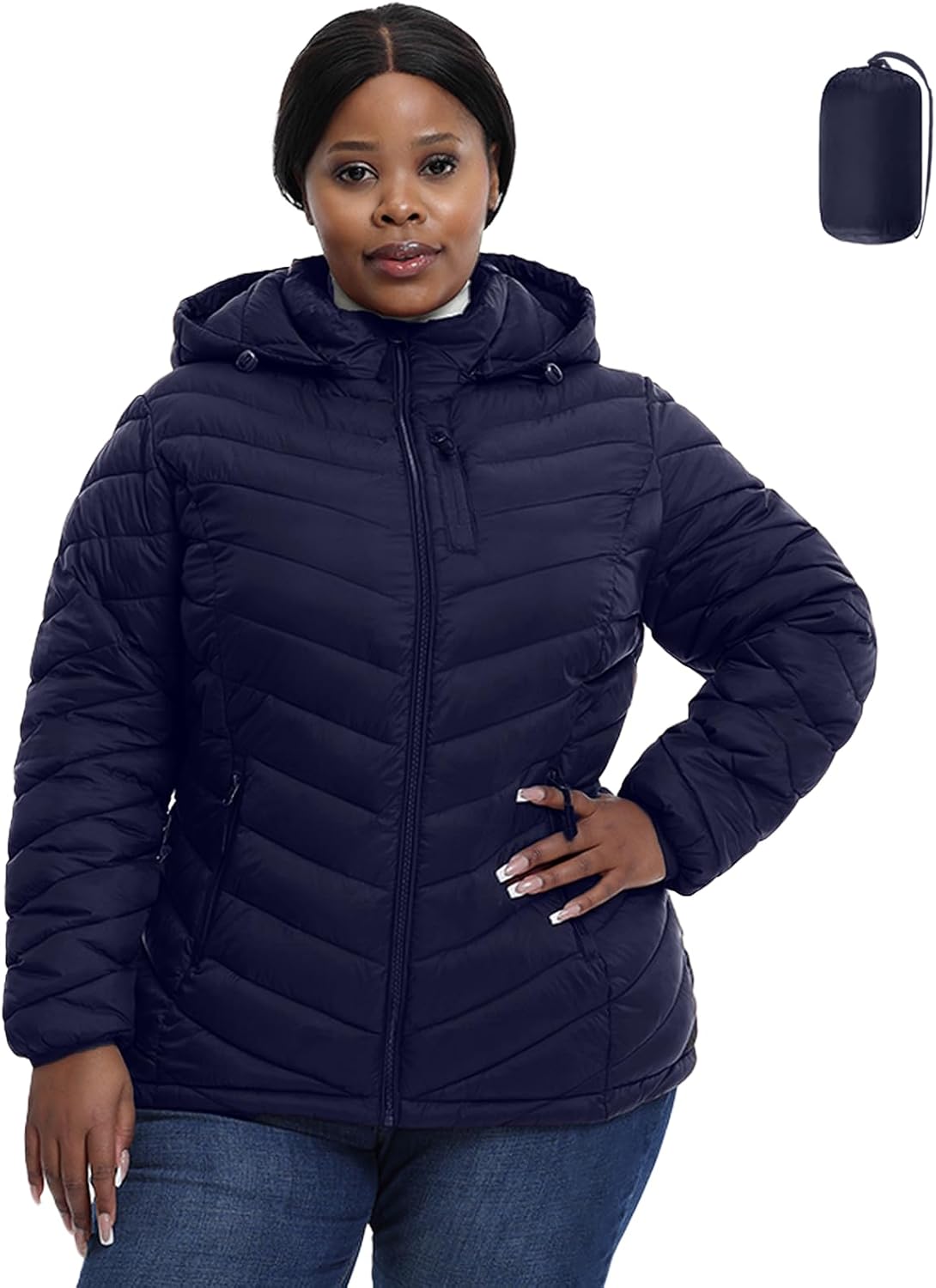 Plus Size Women Packable Puffer Jacket 1X-6X Water-Resistant Lightweight Coat Detachable Hood(Exclusively Plus Size)