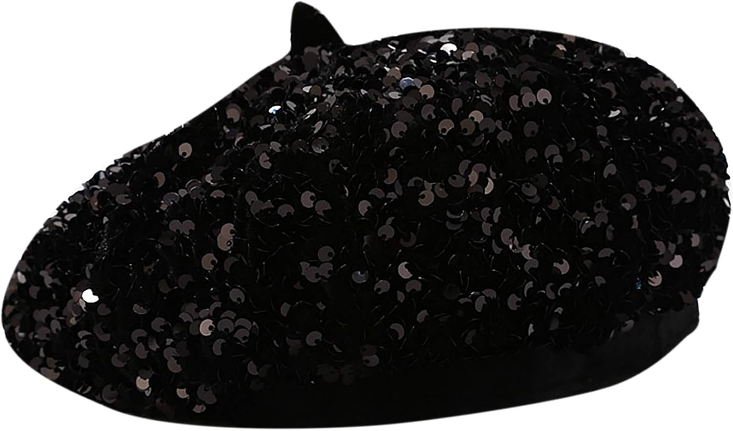 Women Beret Hat Glitter Sequins French Style Beanie Cap Adjustable Fashion Shimmer Hat for Girls Ladies