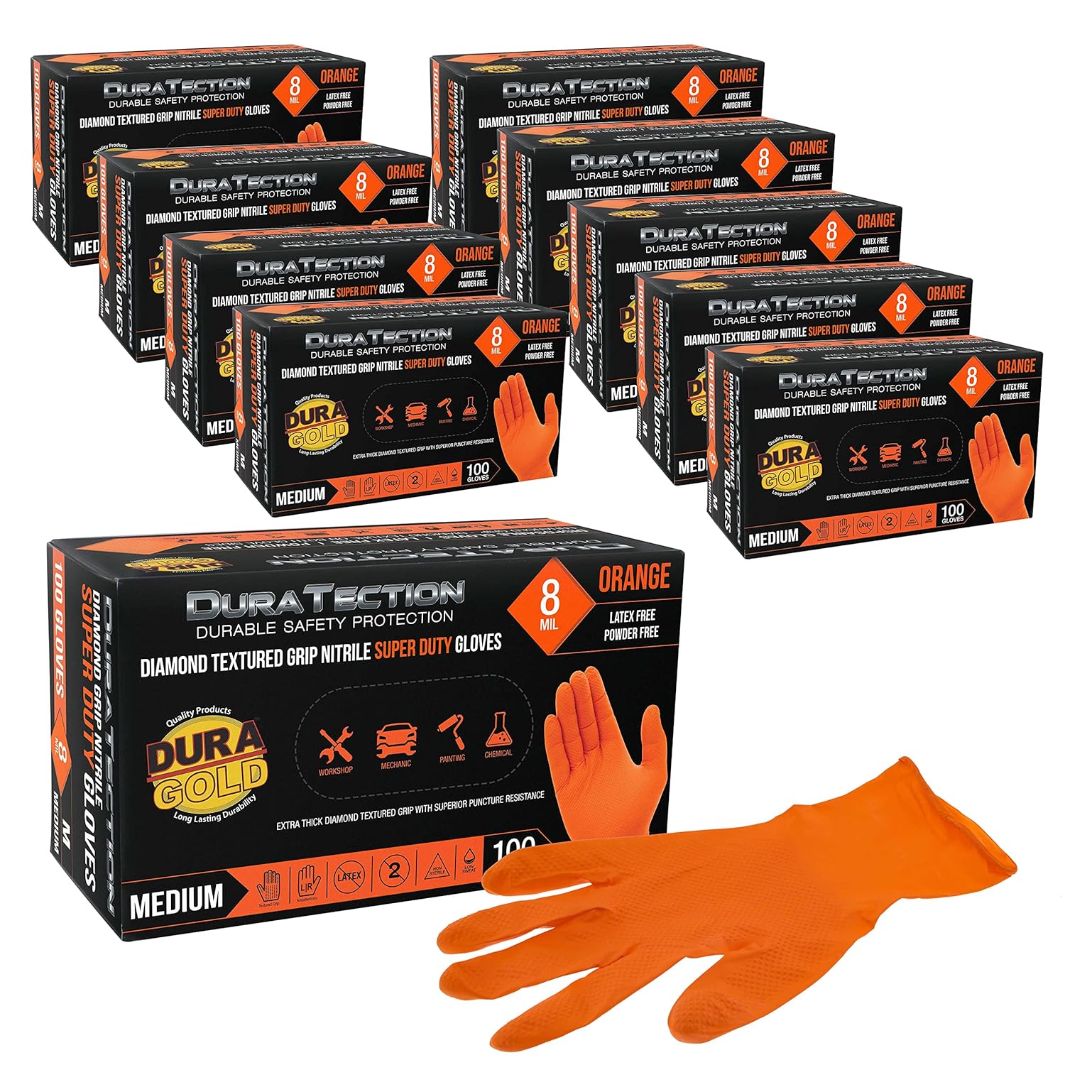 - Dura-Gold Duratection 8 MIL Orange Super Duty Diamond Textured Nitrile Disposable Gloves, 10 Boxes of 100, Medium-Sized. Super strong, extra-thick 8 mil nitrile gloves with superior puncture resistance against cuts, snags, and abrasions for maximum safety protection. They offer incredible stretch with no tearing or pinching. See our glove sizing chart image to determine your correct glove size.