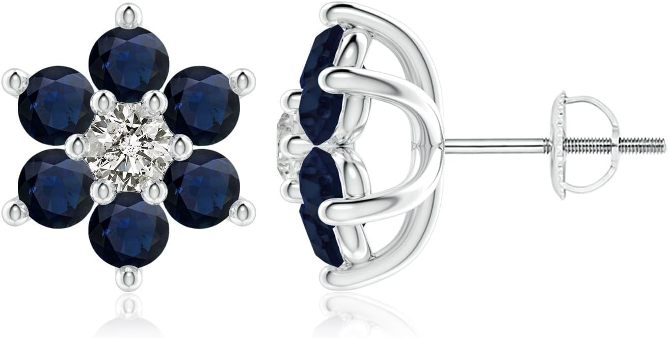 ANGARA Natural Blue Sapphire Earrings for Women | Six Petal Diamond and Sapphire Flower Stud Earrings in 14K Solid Gold/Platinum | September Birthday, Anniversary, Gemstone Jewellery Gift