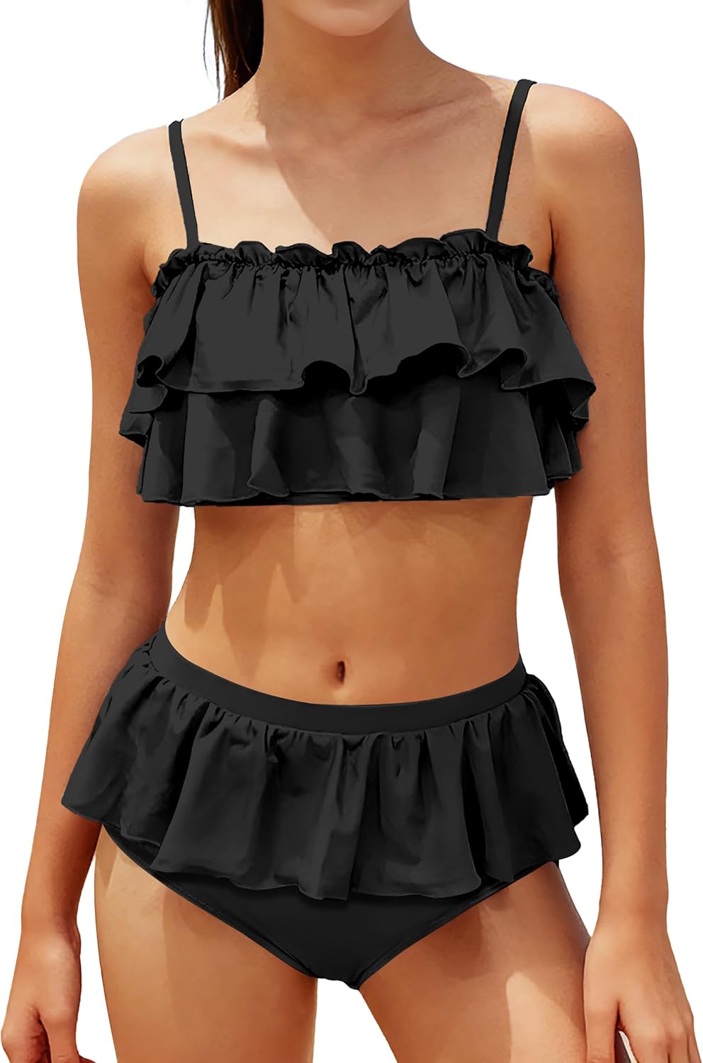 NAPU Girls Swimsuit Ruffled 2 Piece Bikini Set Girls Bathing Suit Tiered Swimsuits Adjustable Straps Beach Swimwear 9-16Y