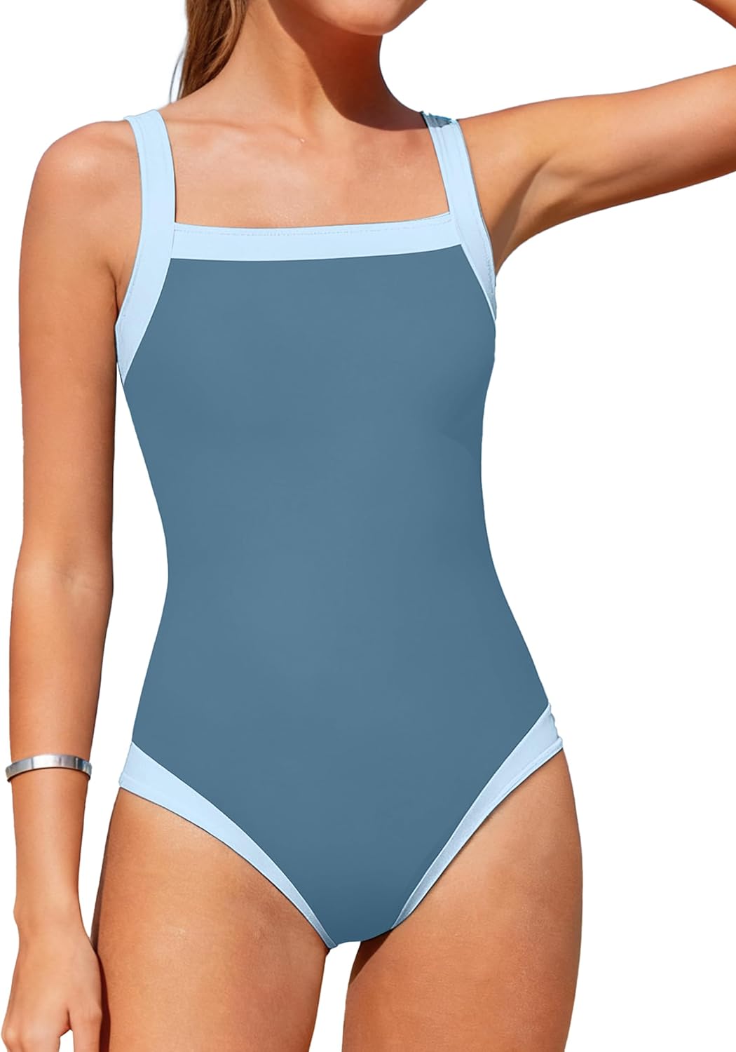 Cuddomper Girls Swimsuit One Piece Bathing Suit Color Contrast Trim Adjustable Strap Drawstring Swimwear for Teens Size 9-16