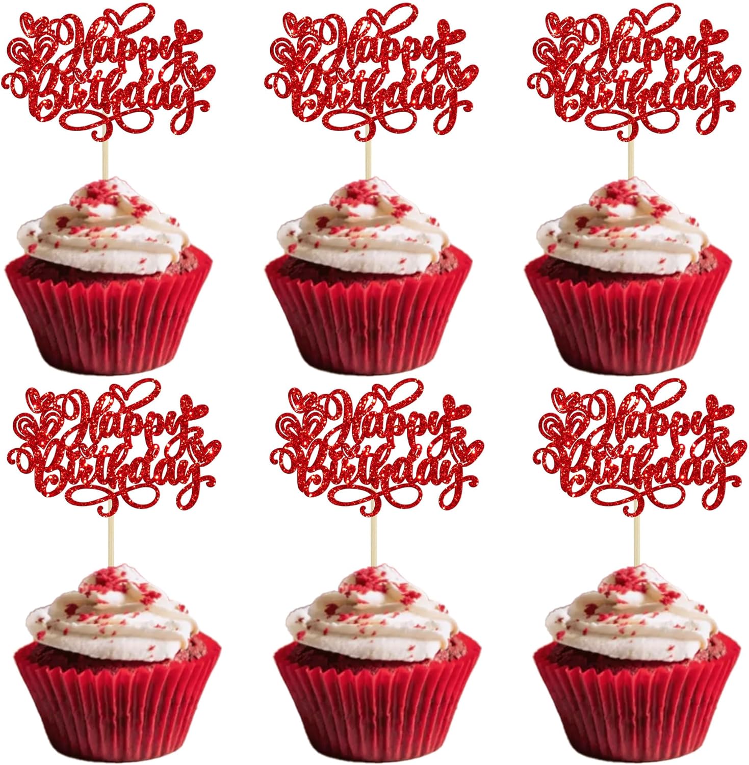 Ephlyn 24Pcs Valentine's Day Happy Birthday Cupcake Toppers Glitter Sweet Love Heart Valentine's Day Cupcake Picks for Valentine's Day Birthday Party Cake Decorations Supplies Red
