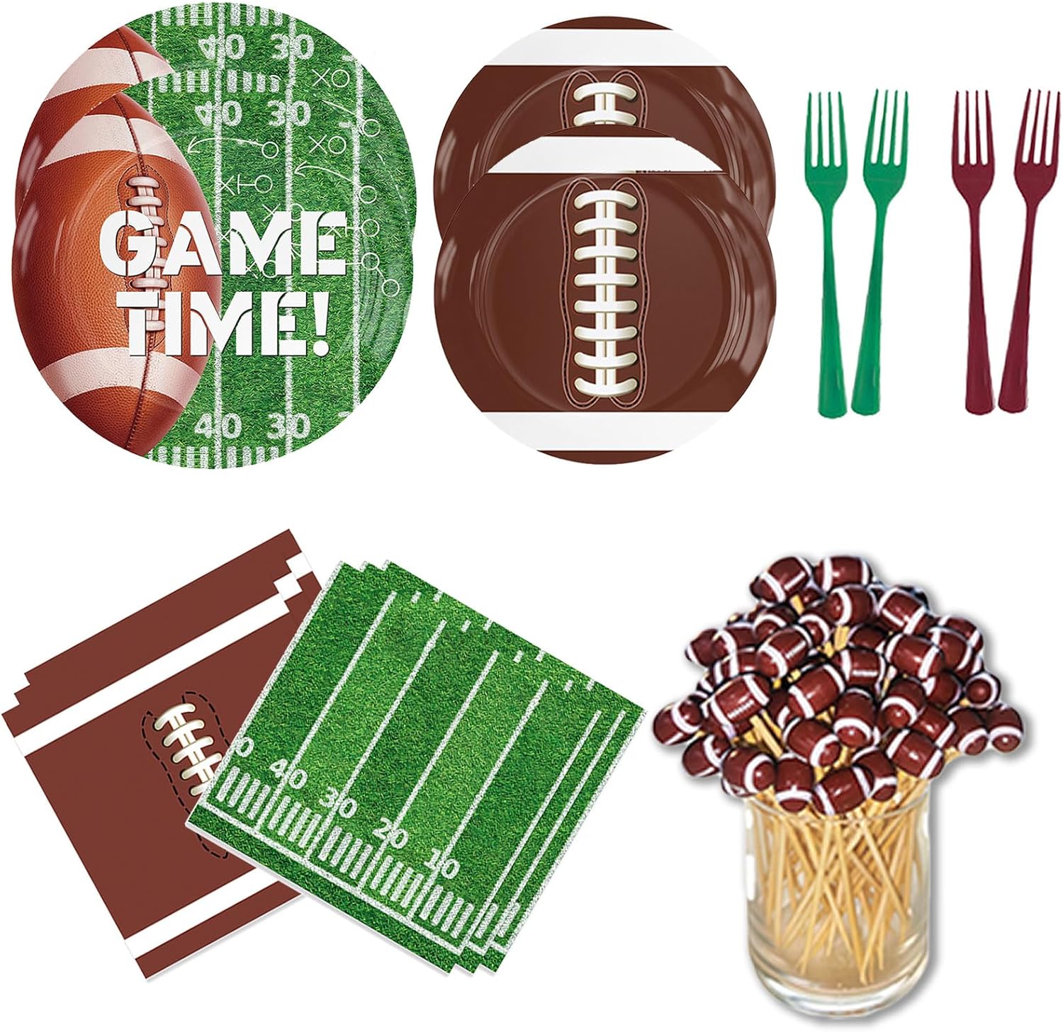- COMPLETE 20 GUEST PARTY KIT: This football-themed tableware pack includes everything you need for a hassle-free party: 20 × 9” dinner plates, 20 × 7” dessert plates, 20 napkins, 20 plastic forks, and 50 3D football topper toothpicks