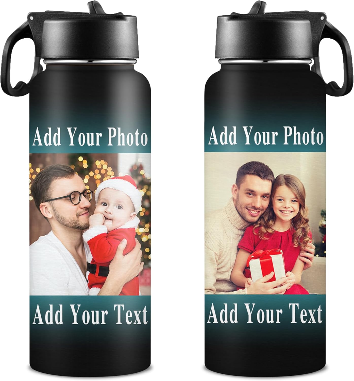 Personalized Water Bottles with Straw 18oz/32oz Double-sided Printing Stainless Steel Insulated Water Bottle with Photo Customized Christmas Gifts for Dad Mom Grandma Grandpa