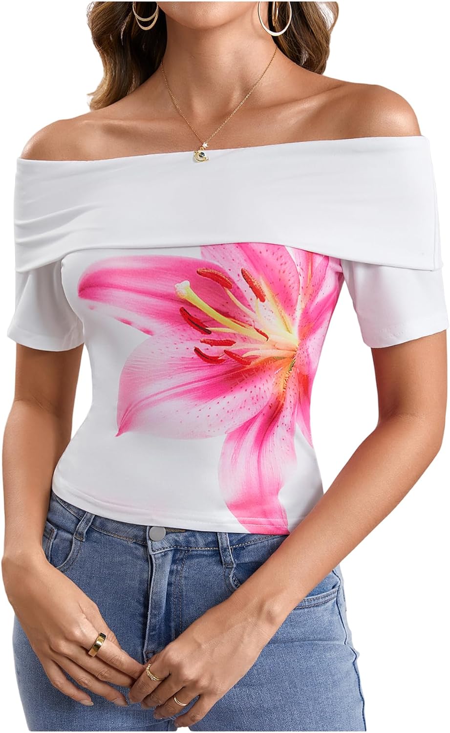 Women's Off Shoulder Crop Tops Short Sleeve Foldover Floral Going Out Shirts