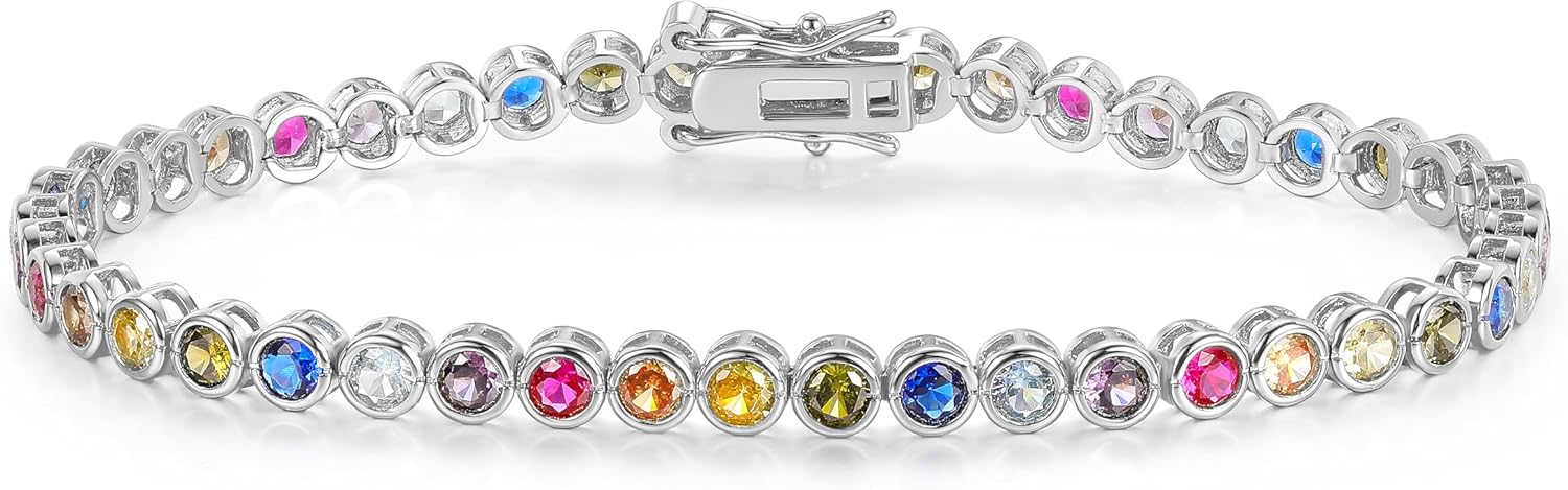 Gemsme 3.0mm Colorful Tennis Link Bracelet, 18K White/Yellow Gold Plated Bezel-Set 3MM Cubic Zirconia Rainbow Tennis Bracelet for Women 6-8.5 Inches