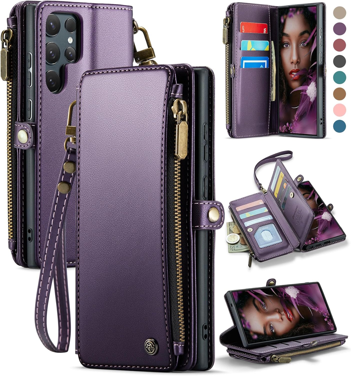 Defencase for Galaxy S25 Ultra Case Wallet with RFID Blocking Card Holder for Women Men, PU Leather Magnetic Snap Flip Wrist Strap Zipper Wallet Phone Cases for Samsung Galaxy S25 Ultra 6.9", Purple