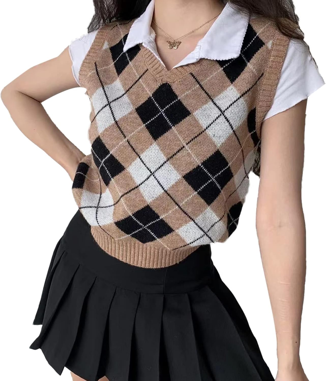 Hyipels Women's Sweater Vest,Y2K Sleeveless Pattern Preppy Style Knitted Crop Tank Top for Girl