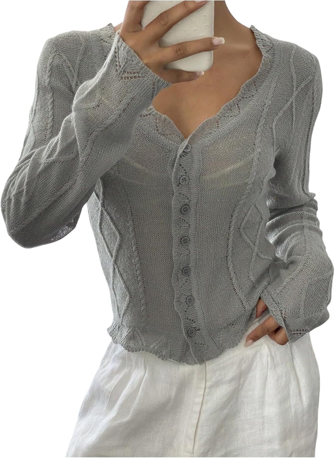 Women's Cardigans Lightweight Sheer Button Down Cardigan Trim Frills Sweaters V Neck Long Sleeve Shrug