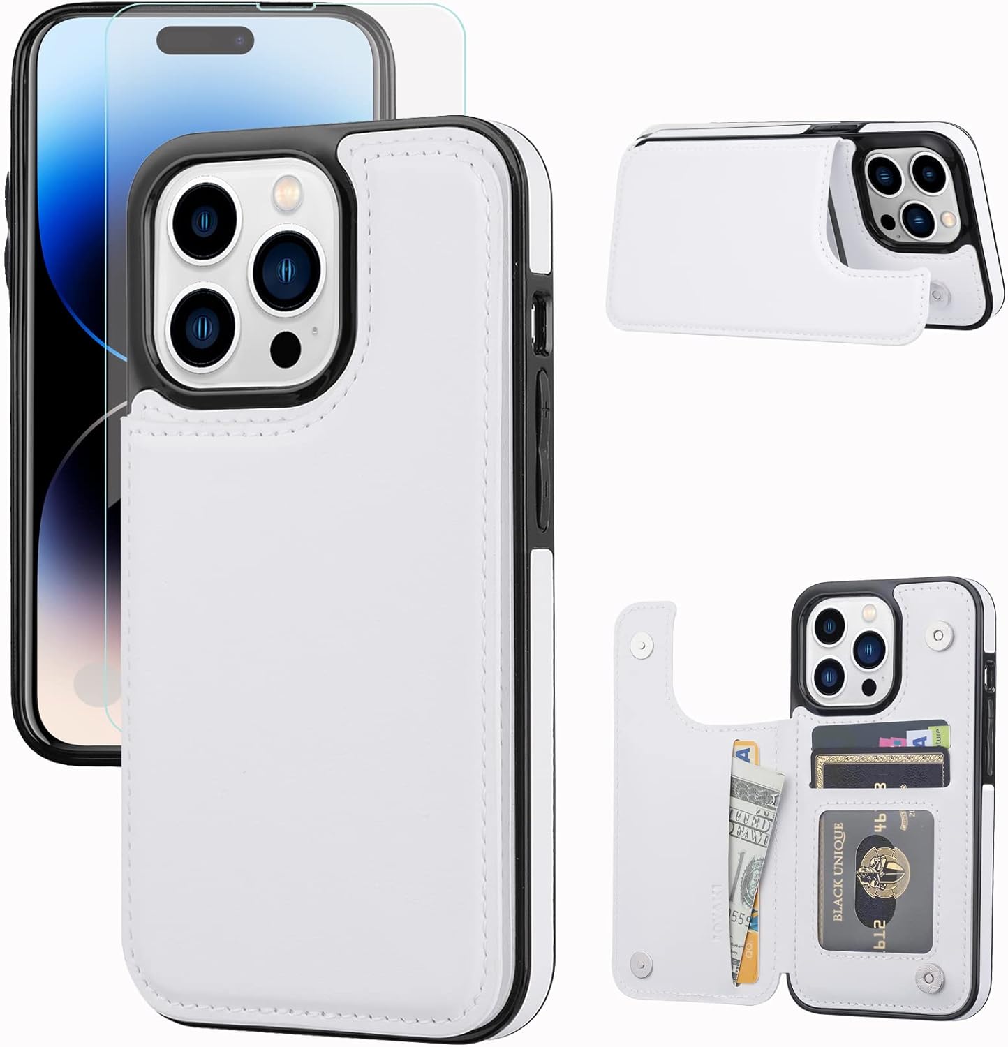 Wallet Case Compatible with iPhone 14 Pro, Slim Protective case with Card Holder,Premium PU Leather Kickstand Card Slots Case with a Screen Protective Glass -White