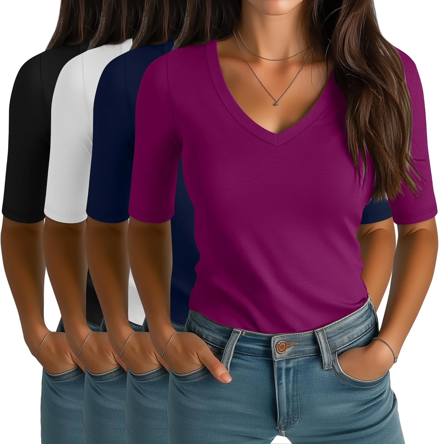 4 Pack Elbow Length Tee Shirts for Women V Neck Half Sleeve T Shirts Slim Fit 1/2 Sleeve Tops Basic Tees