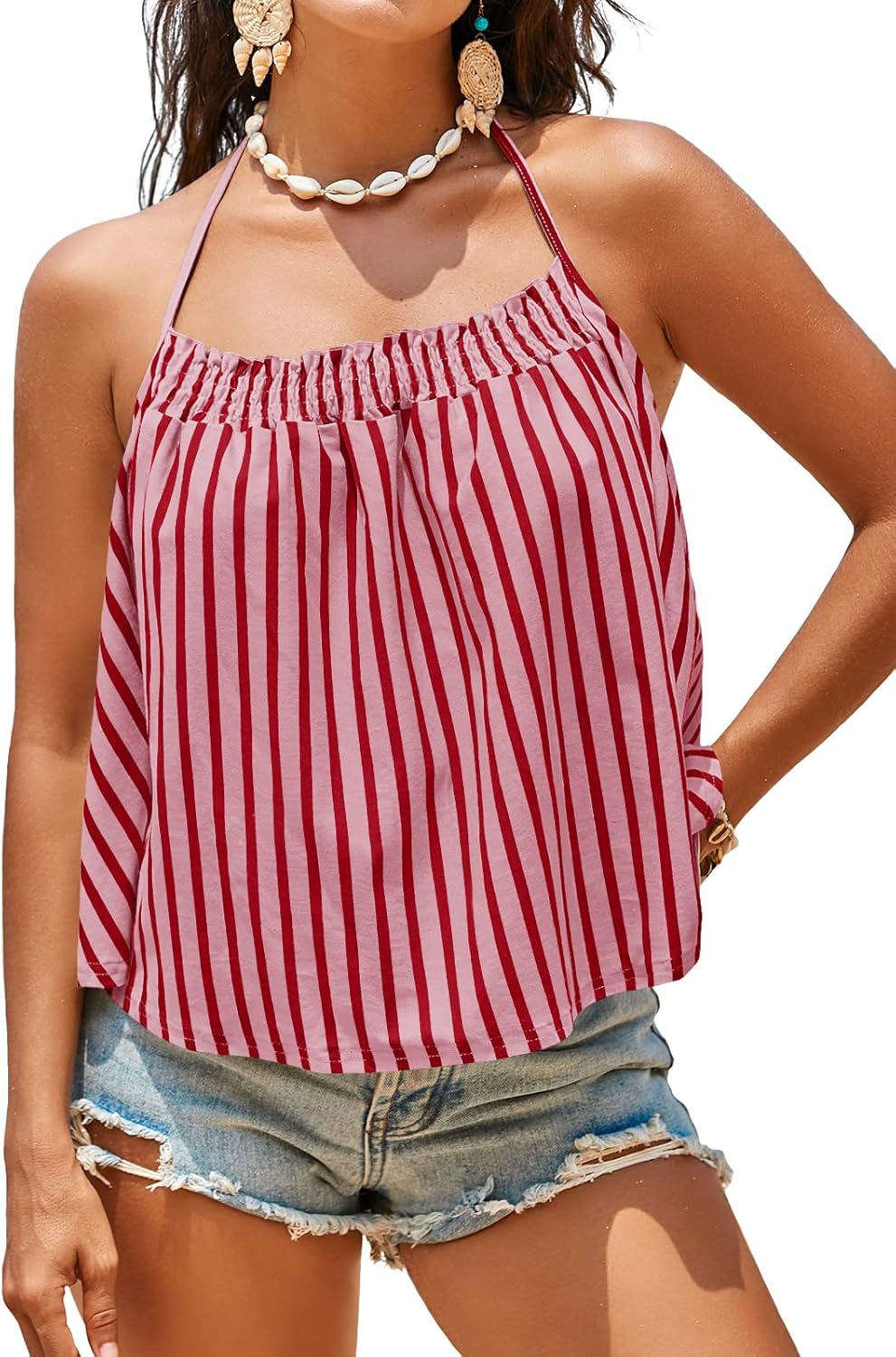 Tankaneo Womens Striped Halter Camisole Tank Tops Vacation Open Back Crop Tops Flowy Pleated Y2k Tshirts