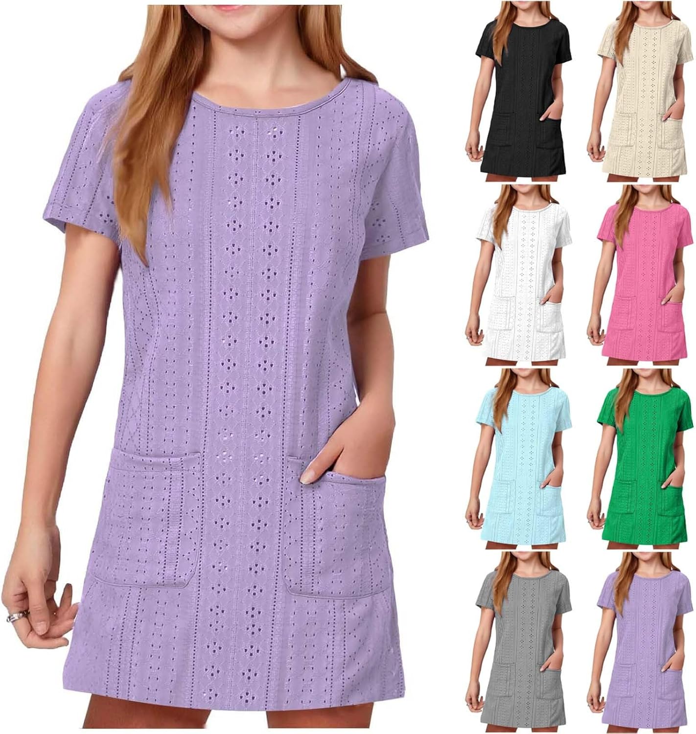 Girls Short Sleeve Eyelet Dresses Crew Neck Mini Shift Dress with Pockets Summer Beach Vacation Casual Dress