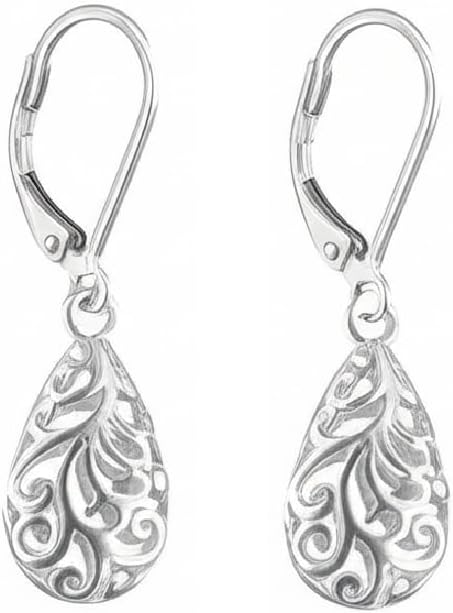 Sterling Silver Filigree Drop Leverback Earring with Dangle Teardrop Waterdrop Shape