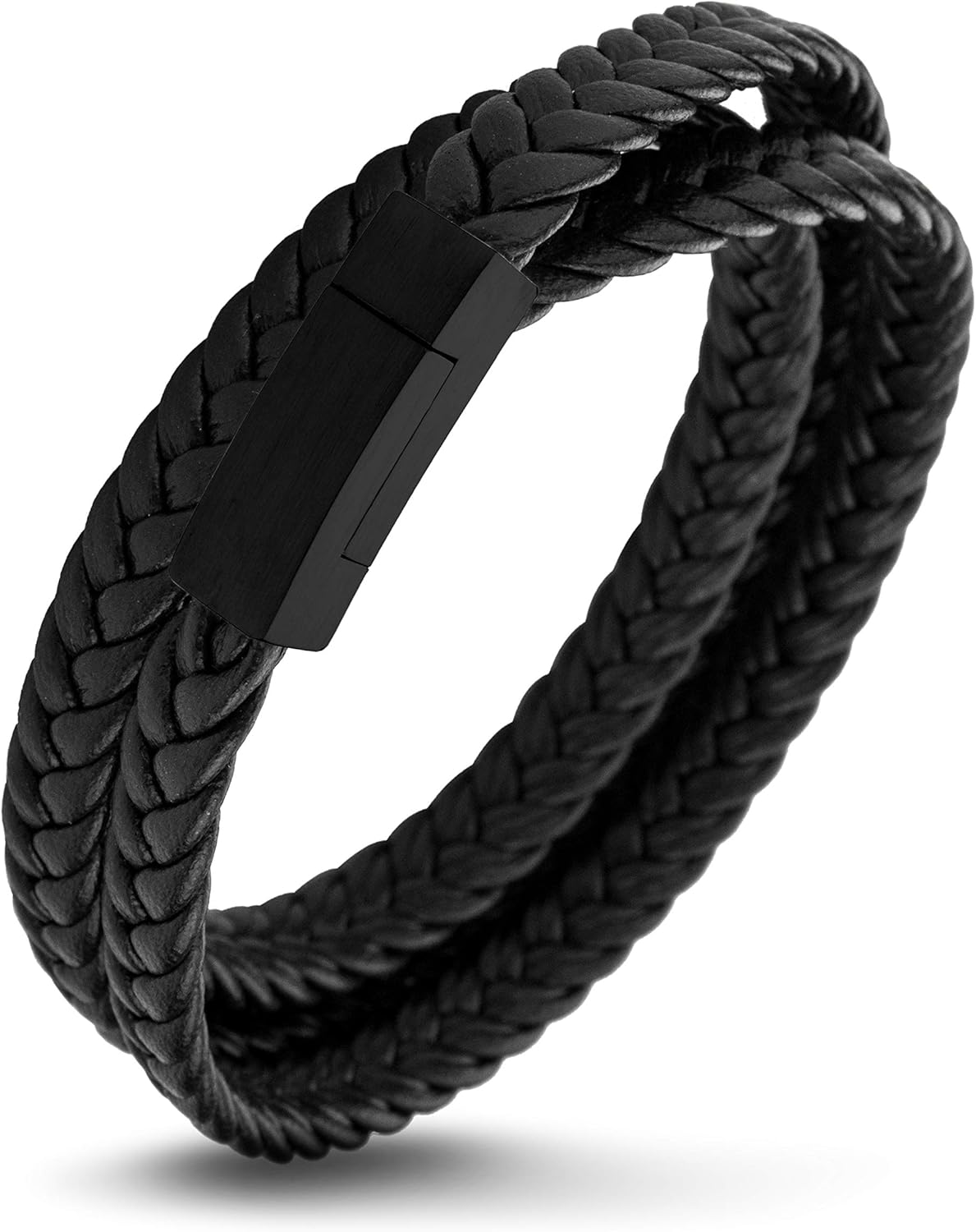 555Jewelry Stainless Steel Braided Double Wrap Leather Twist Rope Chain Cord Adjustable Magnetic Clasp Simple Men Women Unisex Fashion Jewelry Accessory Bangle Bracelet, Black & Black 8 Inch