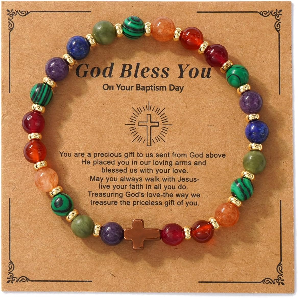 Healing Natural Stone Beaded Bracelet for Women Men Colorful Elastic Stack Crystal Beads Cross Bracelet Friendship Jewelry, Stackable Christian Religious Gifts Inspirational Gifts for Men