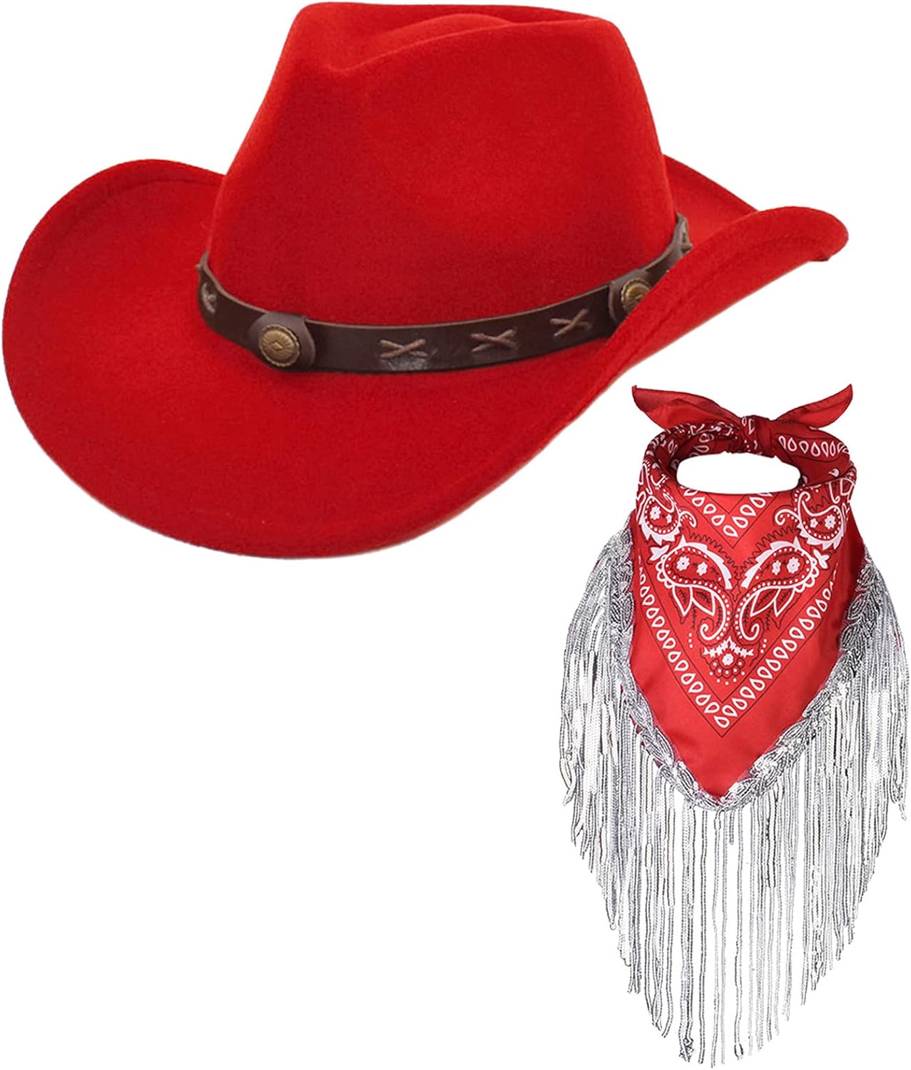 Cowboy Hat with Fringed Bandana Set for Women Wide Brim Western Cowgirl Hat Paisley Head Wrap Scarf