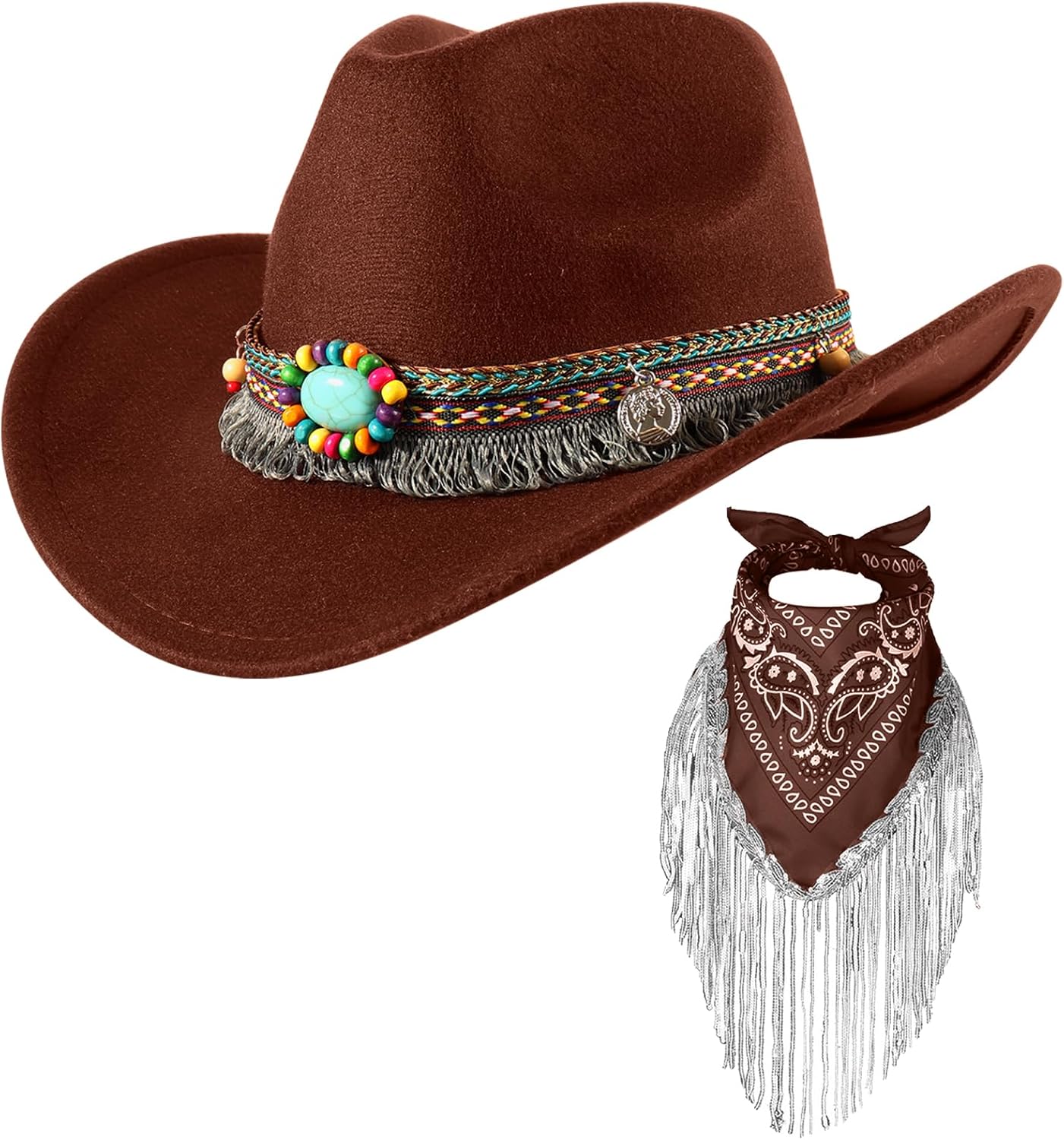 Cowboy Hat with Fringed Bandana Set for Women Wide Brim Western Cowgirl Hat Paisley Head Wrap Scarf