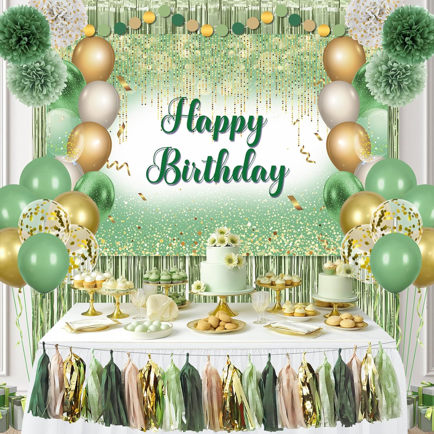 - Green Birthday Decorations Kit: the sage green birthday decorations kit includes 1x green happy birthday banner (35.5x59in), 2x green fringe curtains(3.2x6.5ft), 18x green and gold balloons, 6x tissue paper pompoms, 20x paper tassels, 1x circle garland, offering everything you need for a memorable party setup