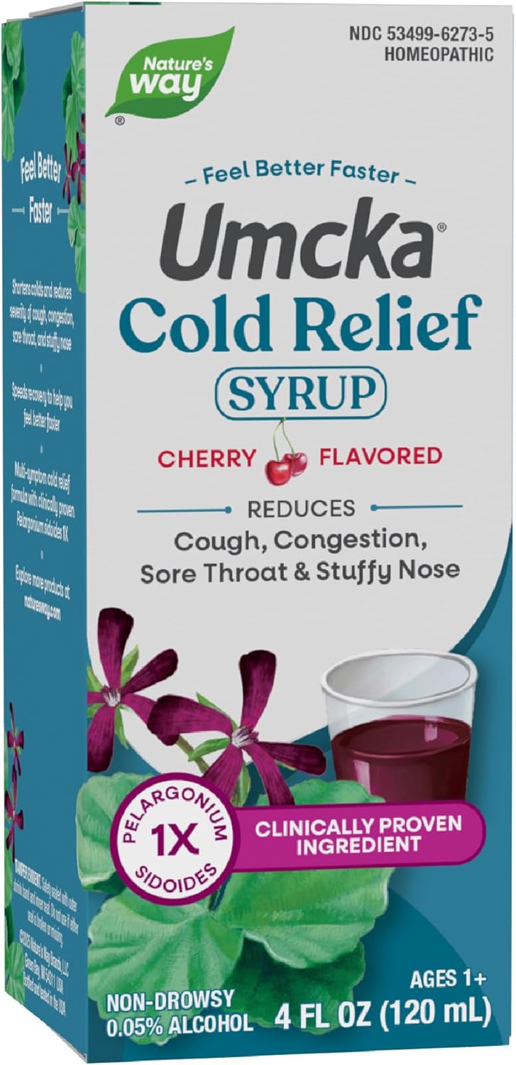 Nature's Way Umcka Cold Relief Syrup, Shortens Duration & Reduces Severity, Multi-Symptom Cold Relief, Homeopathic, Phenylephrine Free, Non-Drowsy, Cherry Flavored, 4 Fl Oz (Packaging May Vary)