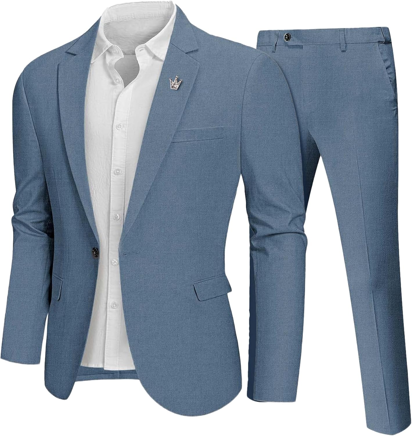 Hihawk Men 2 Piece Regular Fit Linen Suit, Casual Blazer Pants Set, Lightweight Jacket Trouser for Wedding Prom