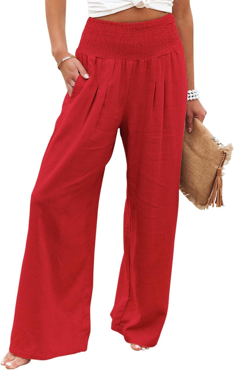 chouyatou Women's Smocked High Waisted Cotton Linen Wide Leg Pants Palazzo with Pockets
