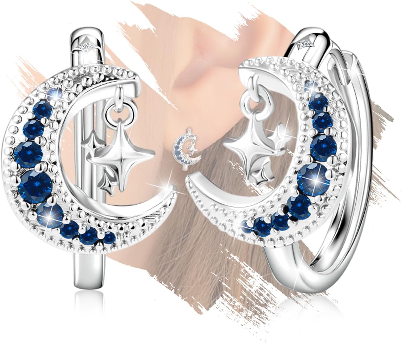 Sterling Silver Earrings for Women Huggie Hoop Charms Cubic Zirconia Star Moon Hypoallergenic Fashion White Gold Plated for Sensitive Ears Dainty Jewelry Birthday Gift