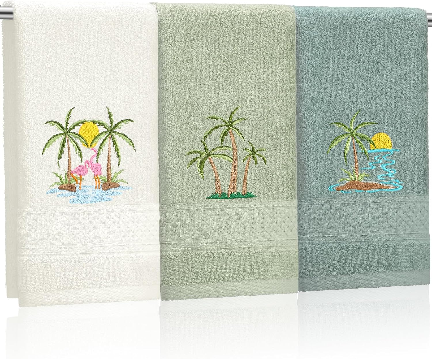 3 Pack Summer Palm Tree Hand Towels for Bathroom 100% Cotton Embroidered Beach Bathroom Towels 13.78 x 29.53 Inch Soft Absorbent(Green Series, Palm Tree)