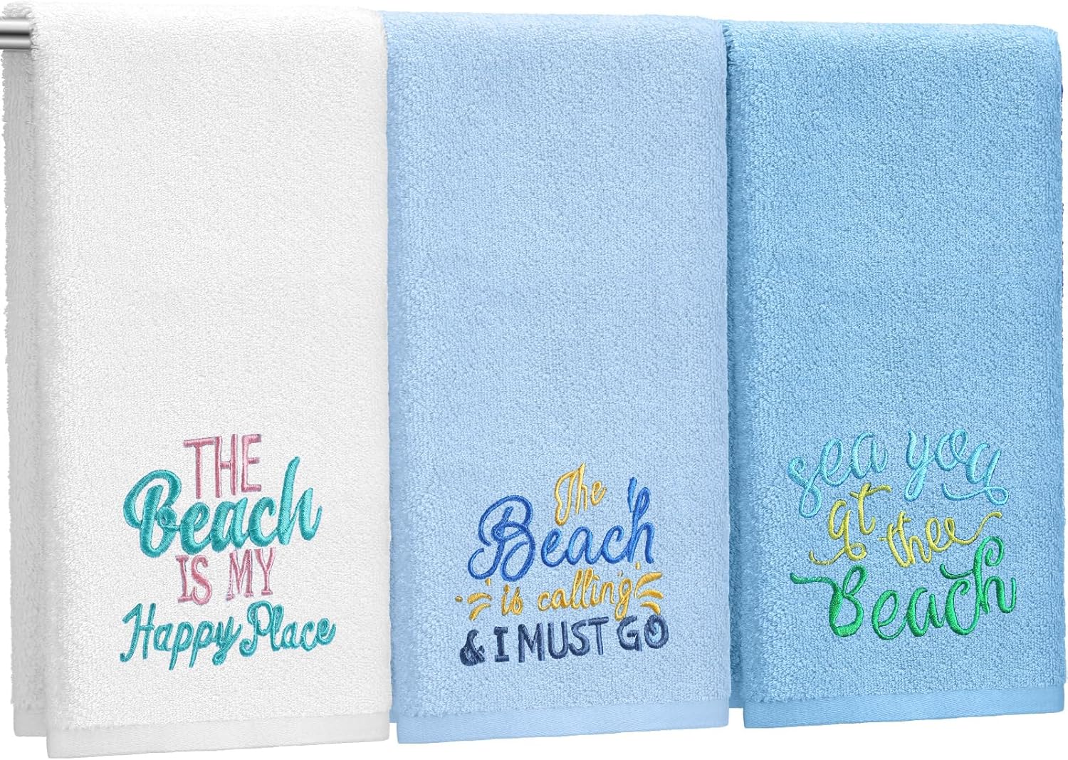 3 Pack Coastal Hand Towels for Bathroom 100% Cotton Embroidered Bathroom Towels 13.78 x 29.53 Inch Hand Towels Soft Absorbent Cotton Towel(Blue Series,Beach)