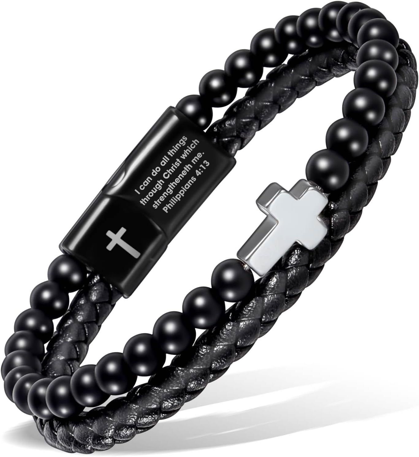 Black Leather Cross Bracelet For Men, Christian Bracelet for Men with Onyx Stone, Mens Jewelry Gifts For Dad Husband Boyfriend Sons