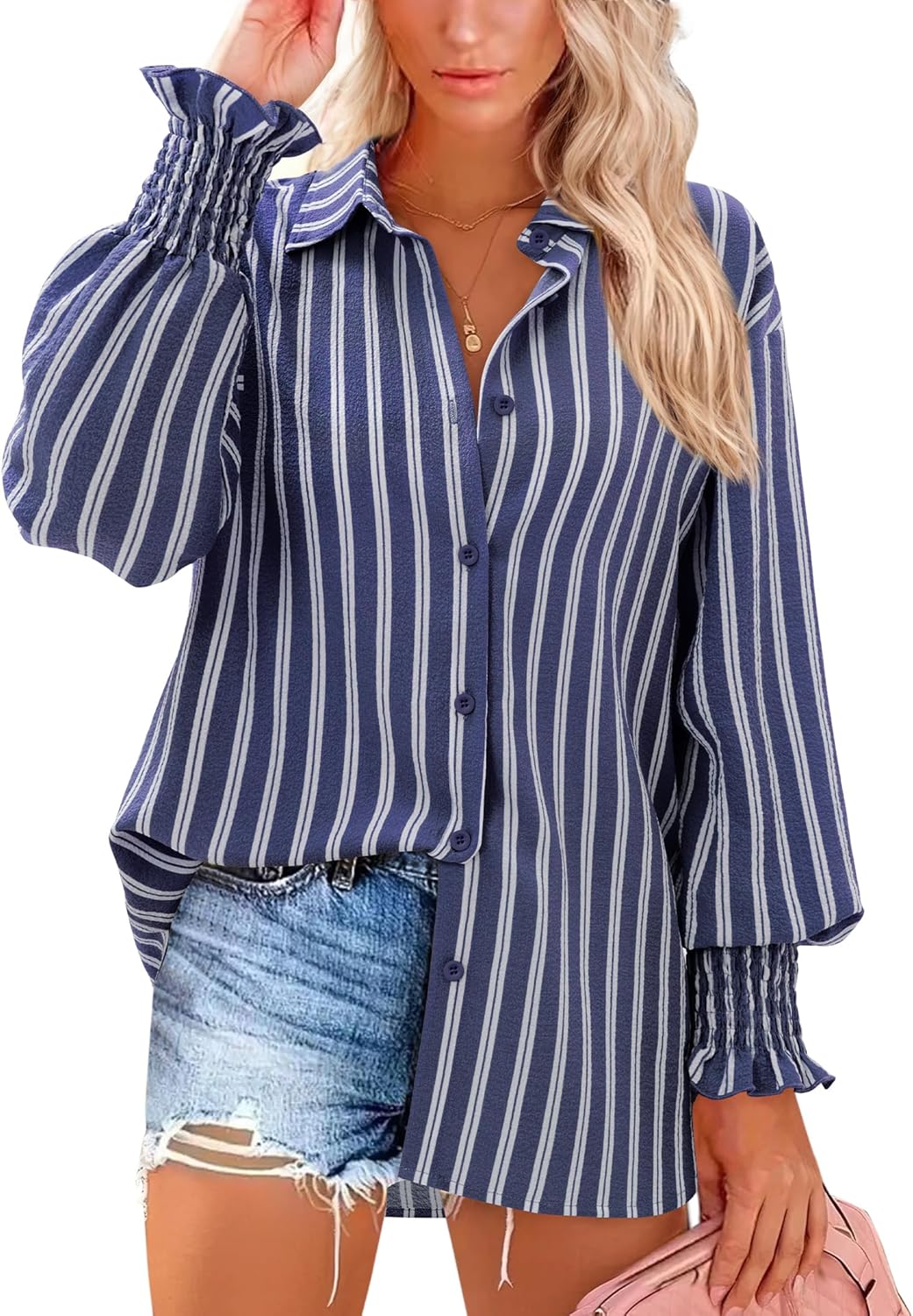 siliteelon Button Down Striped Shirts for Women Smocked Cuffed Long Sleeve Oversized Boyfriend Blouses Collared Work Tops
