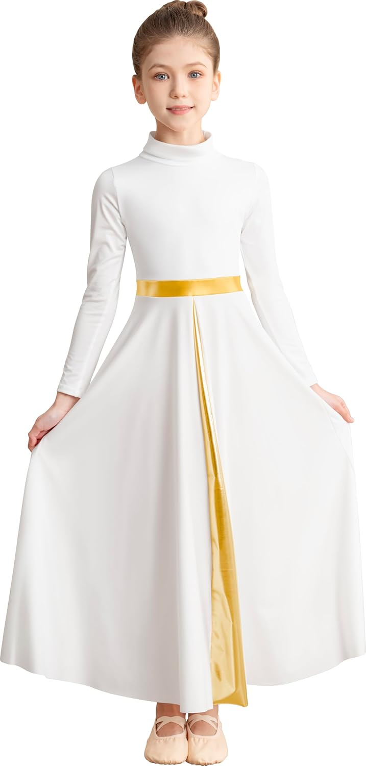 Girls High Neck Praise Dance Dress Loose Fit Full Length Long Sleeve Liturgical Dance Dress
