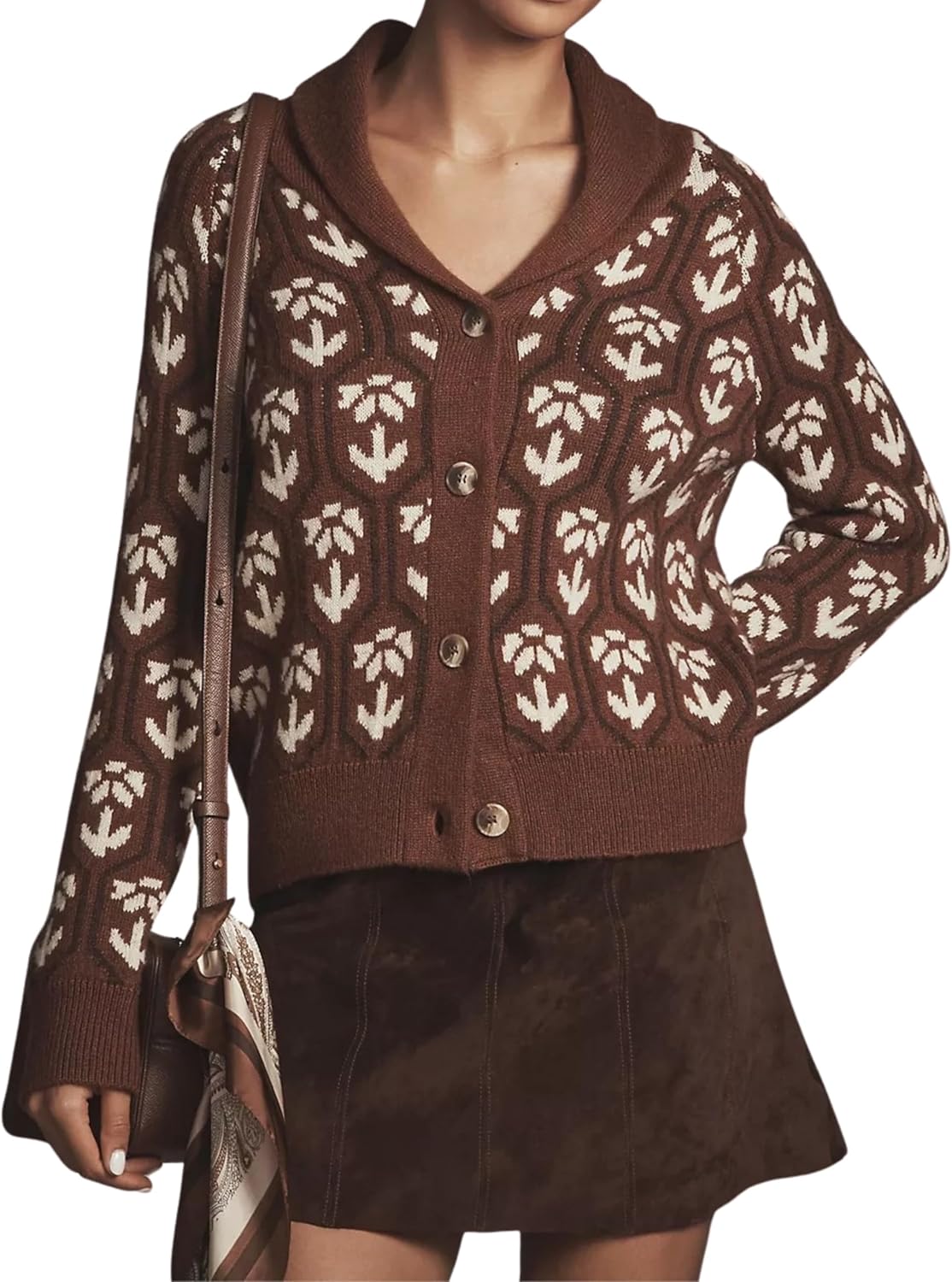 Women Floral Cropped Cardigan Sweaters Shawl Collar Long Sleeve Button Down Knit Jacket Flower Print Knitwear