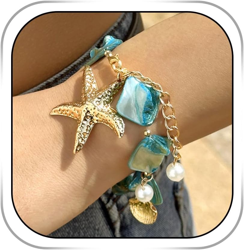 Pearl Shell Bracelets for Women Starfish Pendant Bracelet Boho Summer Bracelet Irregular Sea Shell Bracelets (Blue)