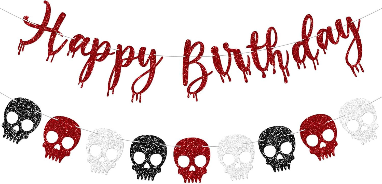 - Great red halloween birthday decorations.The halloween birthday banner combined red blood drop shaped“happy birthday “letter,and the black red silver skull banner garland,unique to leave a deep impression for your guest and family.