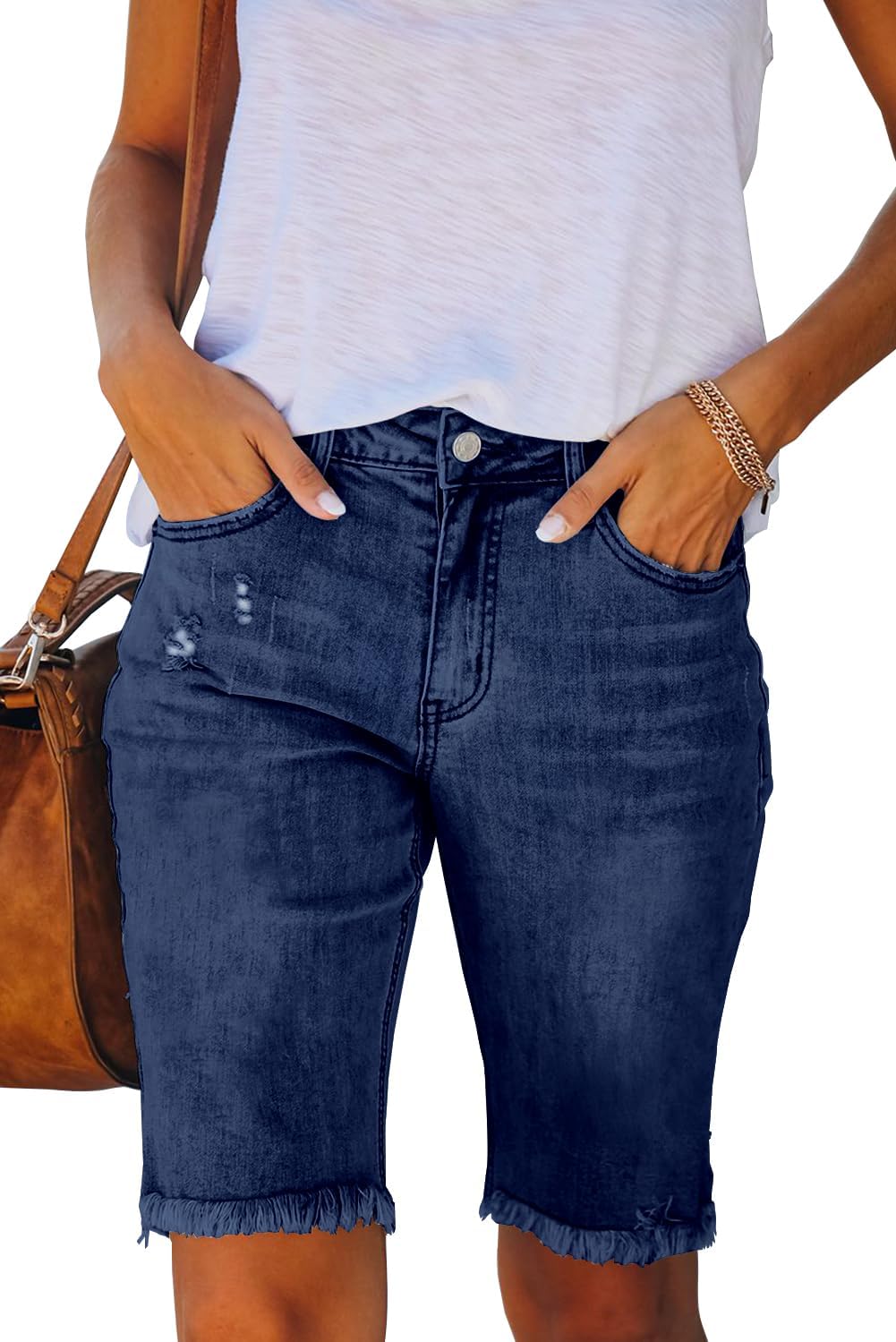 Necooer Women Jean Shorts Ripped Casual Summer Mid Waist Stretchy Five Points Denim Jean Shorts