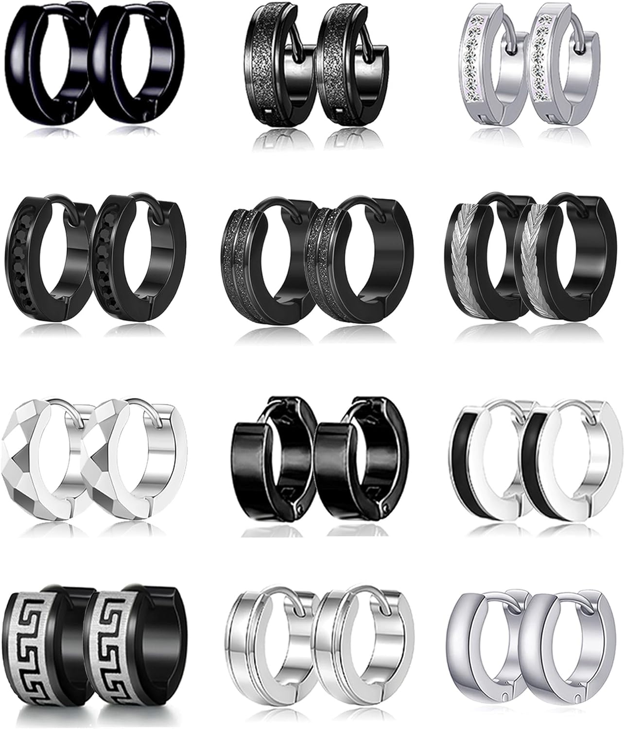 12 Pairs Hoop Earrings for Men Stainless Steel Huggie Earring Round Circle CZ Bevel Edge Unique Greek Key Hoops Piercing Jewelry Set Black Silver Tone