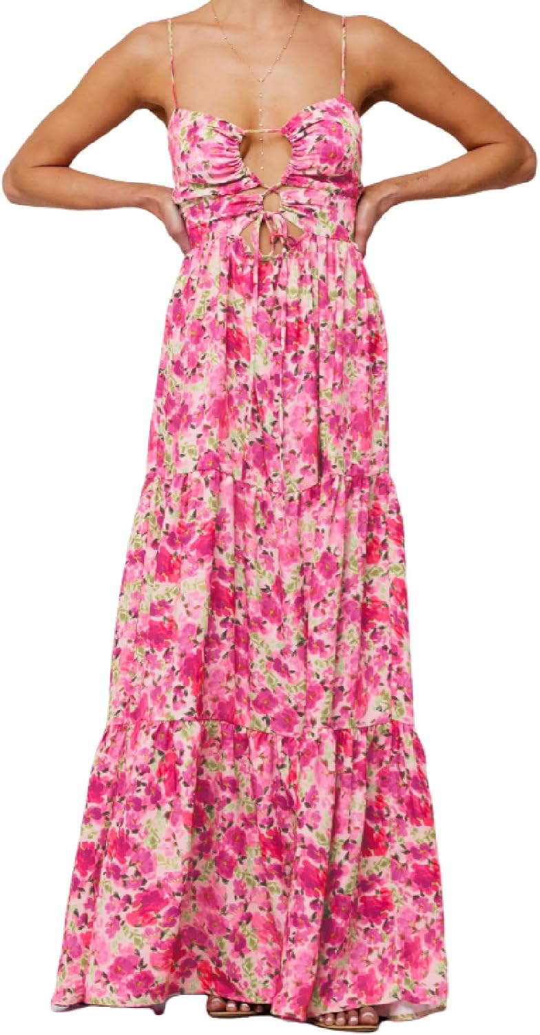 Summer Floral Sundress for Women Spaghetti Straps Hollow Out Tie Front Maxi Dress Flowy Smocked Bohemia Dress