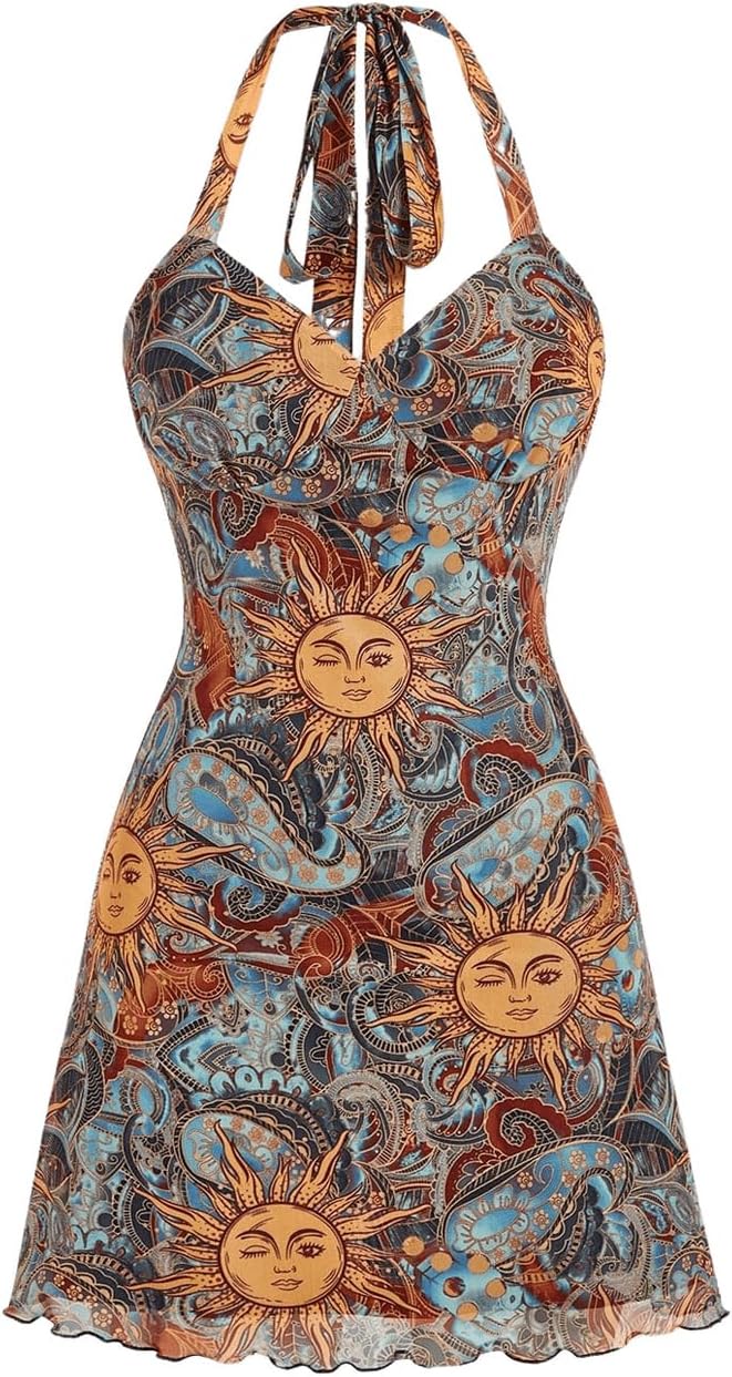 Milumia Women's Vintage Tie Back Halter Dress Boho Print Mesh Short Dresses