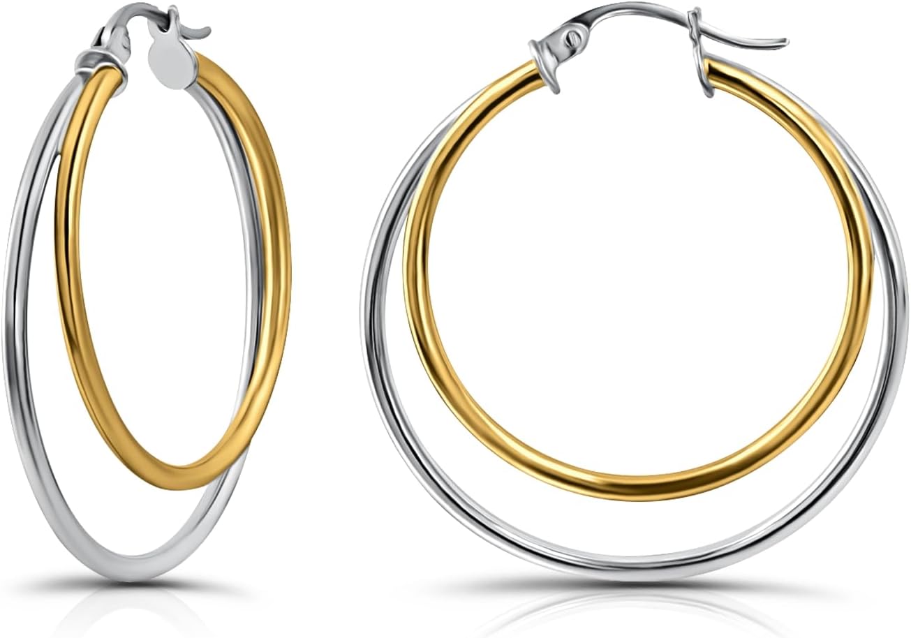 Hoops & Loops 925 Sterling Silver Double Circle Hoop Earrings for Women - 30mm Layered Stacked Circle Round-Tube Click-Top Hoops, Two-Tone 14K Yellow Gold, Rose Gold Flash Plated, Black