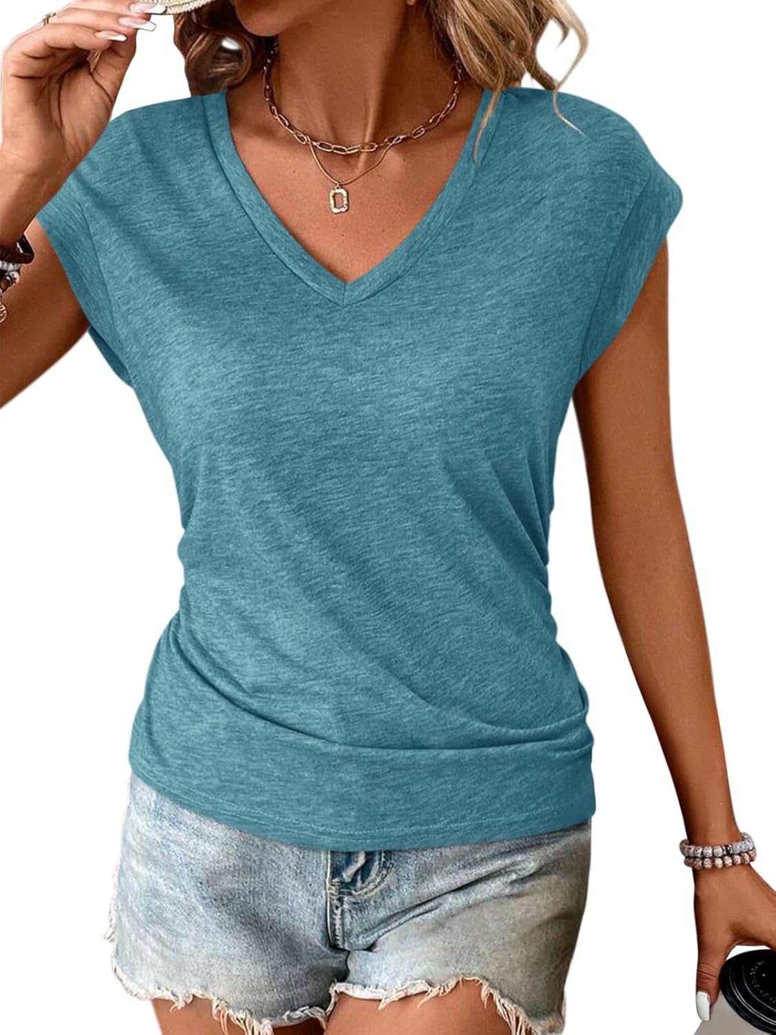 PGANDS Women's V Neck Cap Sleeve Shirts Ruched Dressy Casual Summer Basic Tops